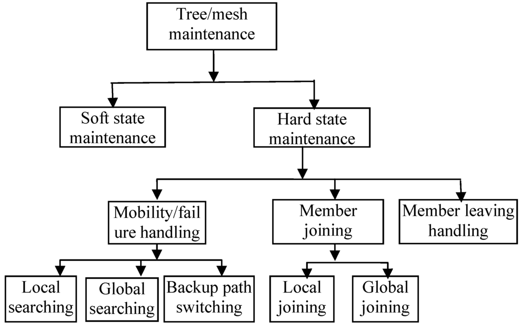 The hybrid approach combines the reactive and the proactive approach or combines the geographical and proactive approach. In [12,13,21], the network is divided into clusters. Each cluster has a cluster head which proactively maintains the local cluster topology. Reactive protocols are used to build the multicast tree/mesh between clusters. The clusters can be formed based on the geographical location of nodes, connectivity, signal range, mobility, or relative location between nodes. CQMRP [12] uses a self-terminating algorithm to build clusters. In LTM [23], the local link-state information is collected periodically for each node to identify the lantern which has one or more sub-paths existing between two nodes. The lantern-tree or multicast tree is then constructed reactively. The protocol QMOST [26] relies on a QoS unicast link state protocol (like QOLSR [56]). The overlay multicast tree is built actively after the source has all the necessary topology information. Two hybrid protocols in [14,28] combine proactive and geographic routing. LACMQR [28] is based on a distributed cluster-based QoS multicast routing algorithm. It requires maintaining the local state at each node. The location information provided by the positioning device is used to discover and maintain routes. HVDB [14] also divides the network into clusters and uses the mobility prediction and location-based clustering technique to form stable clusters. The forwarding between logical nodes is done by a location-based unicast routing algorithm.