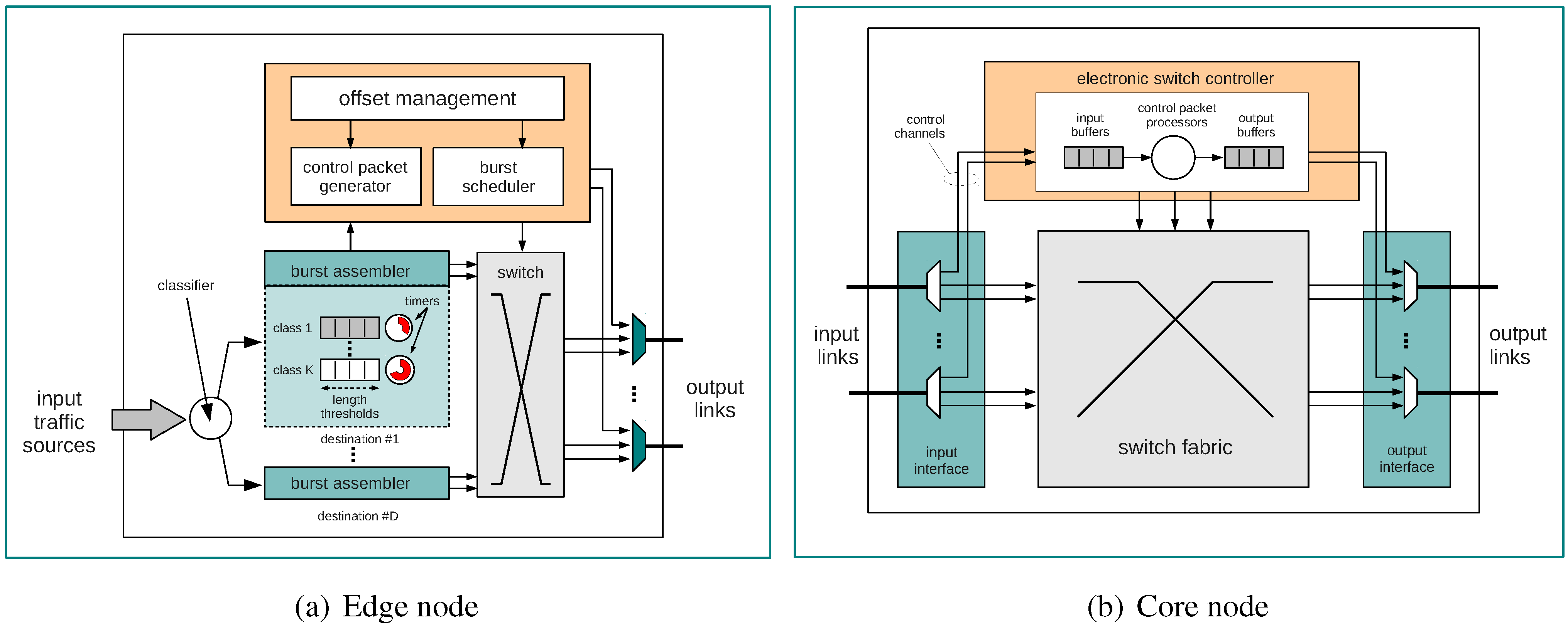 Depending on their sending/receiving status, OBS edge nodes can be viewed either as ingress or as egress nodes. When acting as ingress nodes (see Figure 3(a)), edge nodes are responsible for burst assembly and connection setup mechanisms. Core nodes are located in the core of OBS networks where a transparent switching of bursts from one optical fiber to another takes place (see Figure 1). Core nodes (see Figure 3(b)) perform, the following main functions: scheduling of resources and contention resolution.