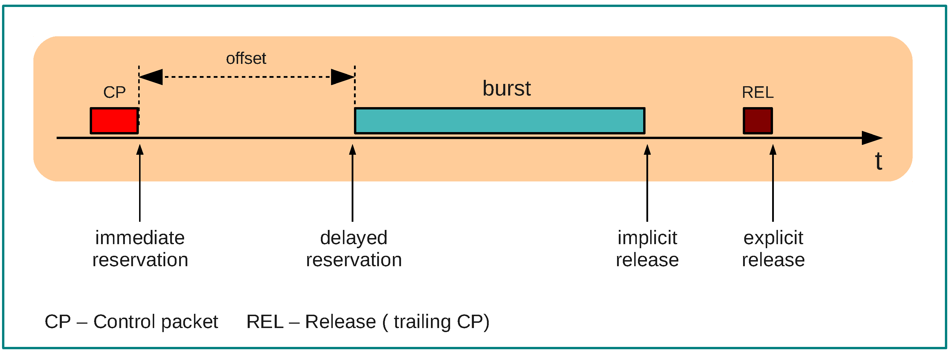 Reservation of resources in the core concerns the capability to ensure undisturbed switching and transmission of bursts from input ports to output ports. This process relies on the information carried on each CP about the corresponding burst, which can include, for instance, the offset and the size. Based on this information, core nodes schedule the resources inside the local optical switching fabrics such that bursts can cut through them. The resource scheduling schemes proposed for OBS networks can be classified based on the duration of the reservation, i.e., taking into account the moment when the reservation of a channel started and the moment when that reservation is released (see Figure 4): immediate reservation, delayed reservation, explicit release, and implicit release. These four mechanisms determine the occupancy of resources inside the switching fabrics for a certain burst. It should be noted that the adopted scheduling scheme is closely related with signaling and also depends on the burst assembly process used by the edge nodes, since the information that the CP can provide depends on the assembly algorithm from which it was generated.