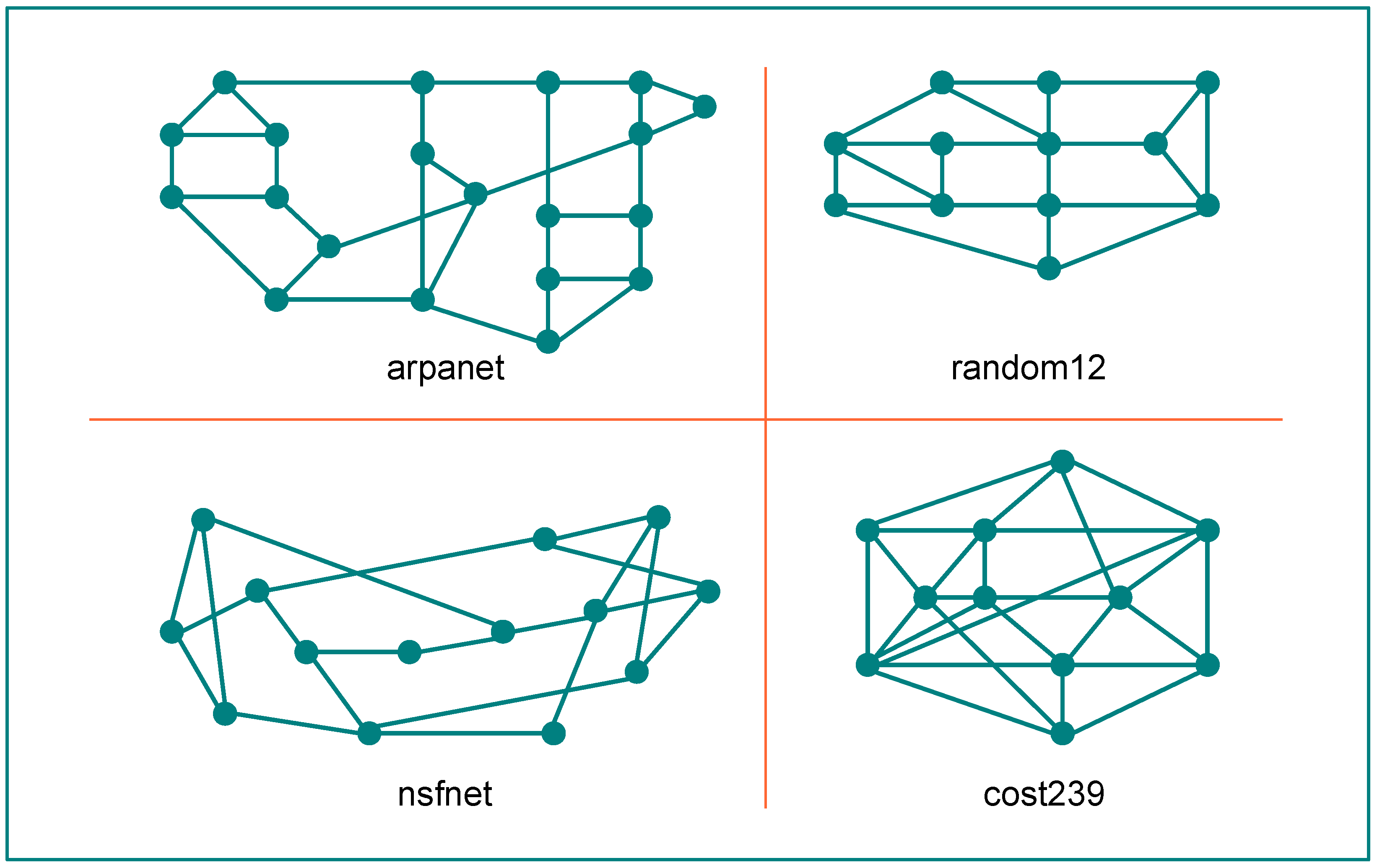 The functional architecture of our OBS model has similar characteristics to the ones presented in [3,60], assuming, like it is done in these proposals, that each node can support both new input traffic generated by the client networks and the in transitu traffic passing all-optically from source to final destination. The simulation studies were done on different networks, including two from North America (ARPANET and NSFNET) one European (COST239) and one with a random configuration of nodes, whose topologies are depicted in Figure 7. Some physical parameters of these networks are presented in Table 1, in which the average degree is considered the average number of physical connections per node, and the physical connectivity is defined as the normalized number of bidirectional links with respect to a physically fully connected network of the same size [61]. The nodes are connected by links representing optical fibers with the same characteristics, i.e., having 16 wavelengths per link with a transmission capacity of 10 gigabits per second (per wavelength).
