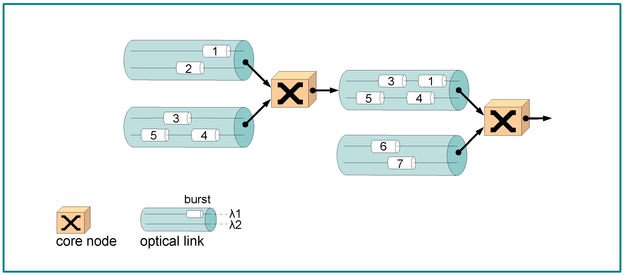 Contention resolution: The core nodes do not employ any buffering in the data path and they do not use deflection routing. It is generally assumed that the nodes are capable of performing a full wavelength conversion. Blocking occurs only if there are no free wavelengths available to accomplish the next hop on a predetermined path to a certain destination. If scheduling fails, the burst is simply dropped and no further contention resolution method is adopted.
