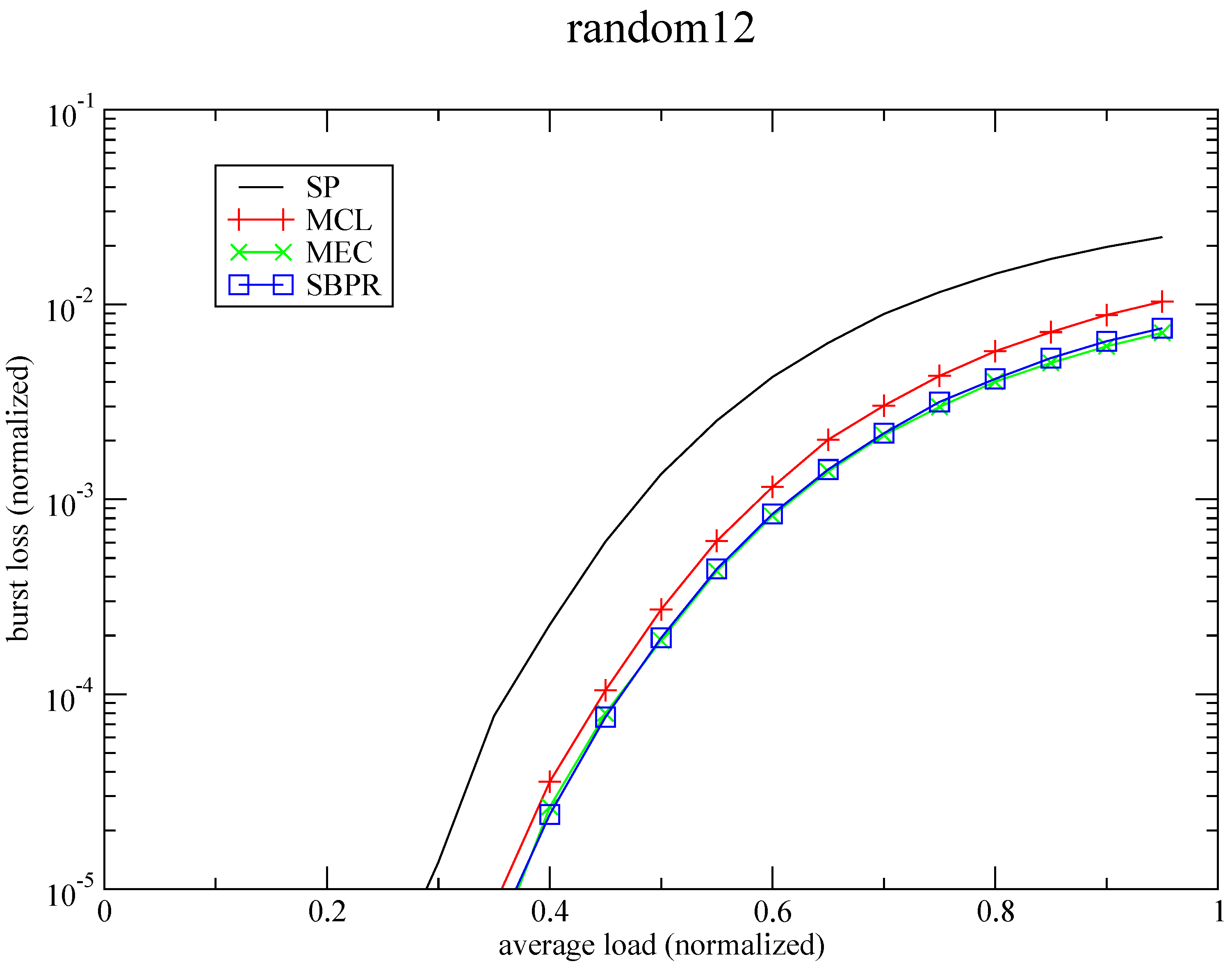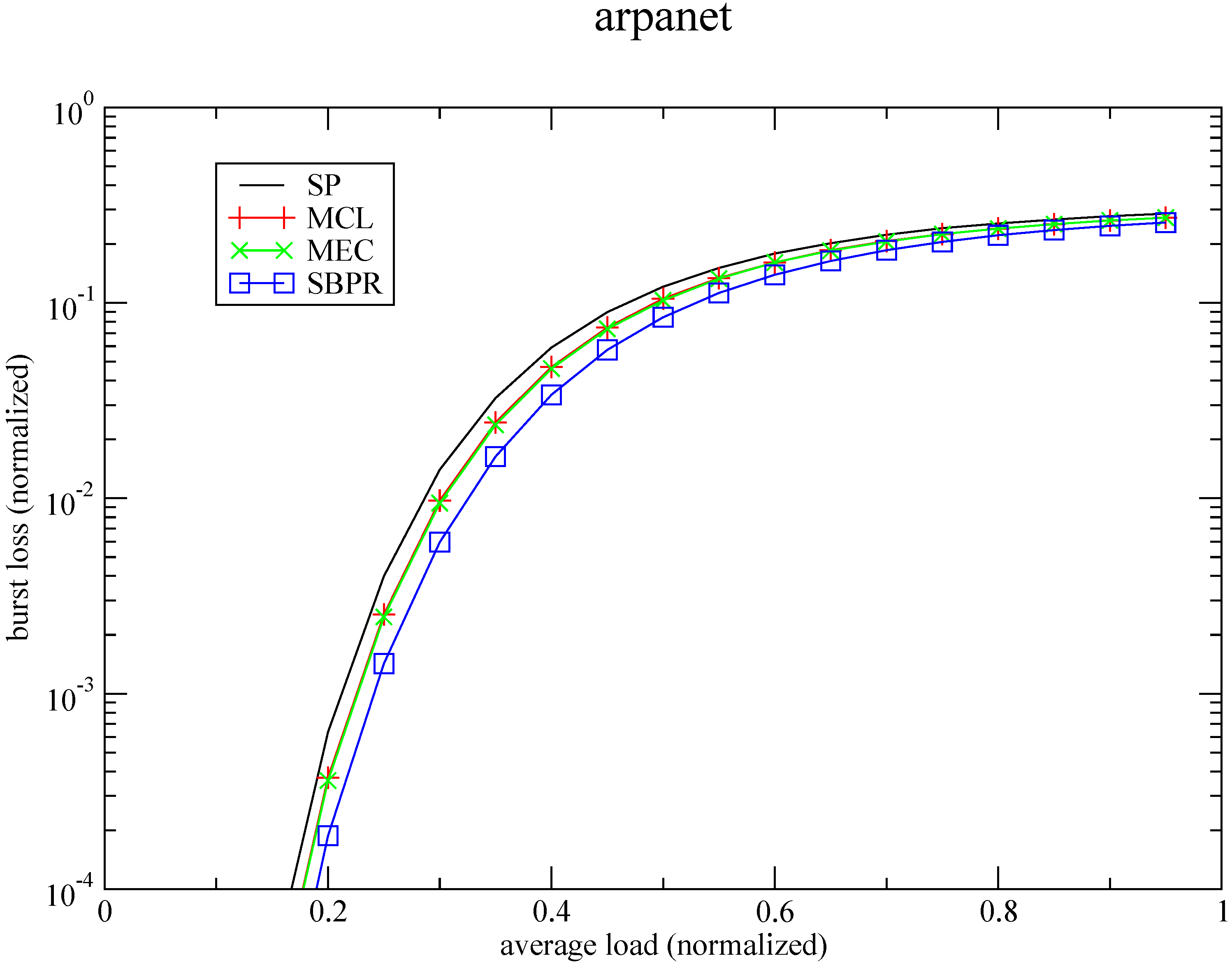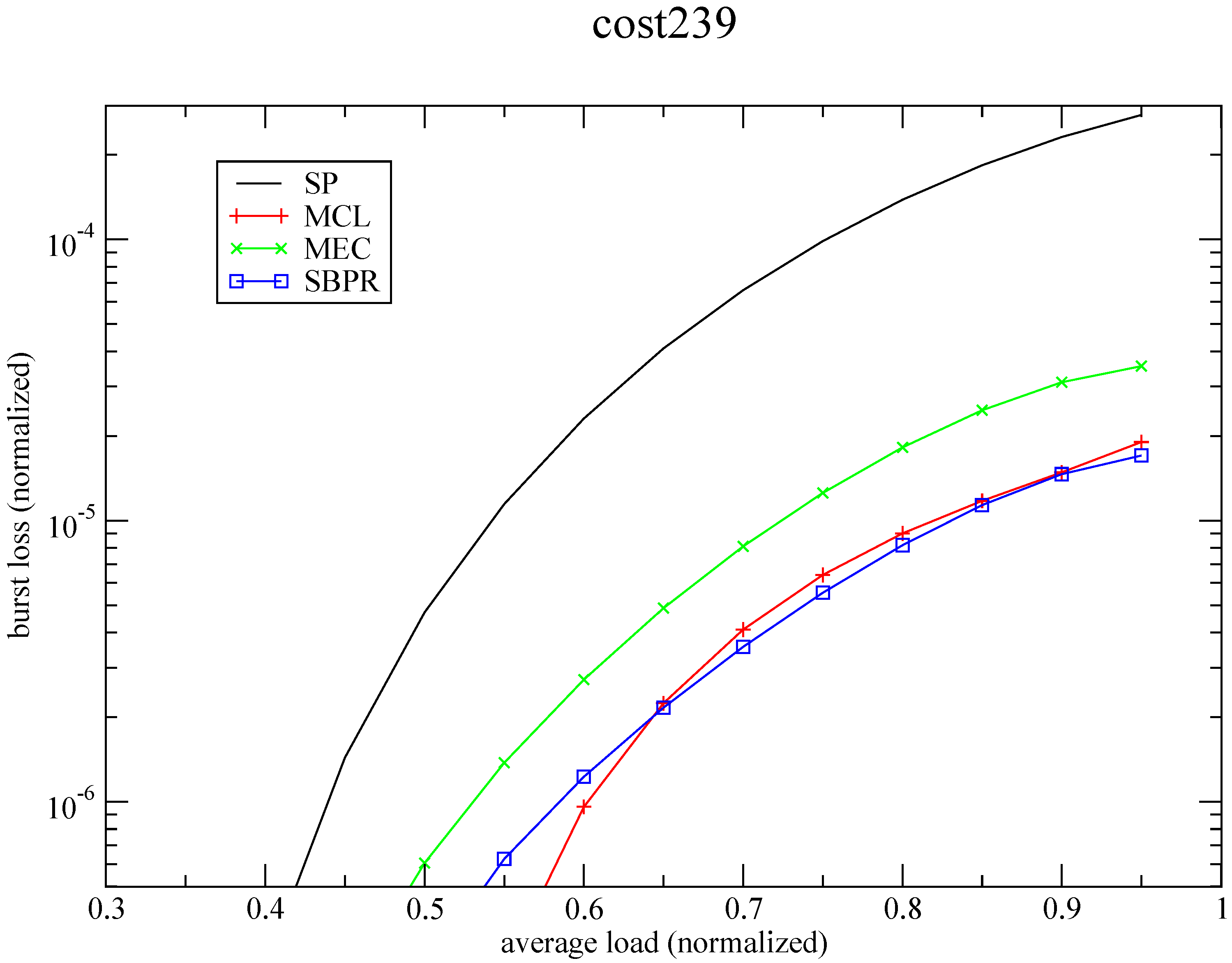 This routing strategies may serve as a basis for the development of QoS policies. If it is truth that the concept of QoS in communication systems is closely related to the network performance of the underlying routing system [69], these strategies, with the obtained results, can be considered as service related primitives allowing for the implementation of high-level differentiation. For instance, considering the curves for burst loss in Figure 14, it is possible to exploit the “no loss” bound of the SBPR algorithm to guarantee no burst loss at all until an average load of 54% of the capacity, and a burst loss ratio of 1 burst in 100,000 for an average traffic load of 80% of the capacity. Obviously, other policies are possible taking advantage of these optimally routed traffic patterns that can be exploited for end-to-end QoS provisioning.