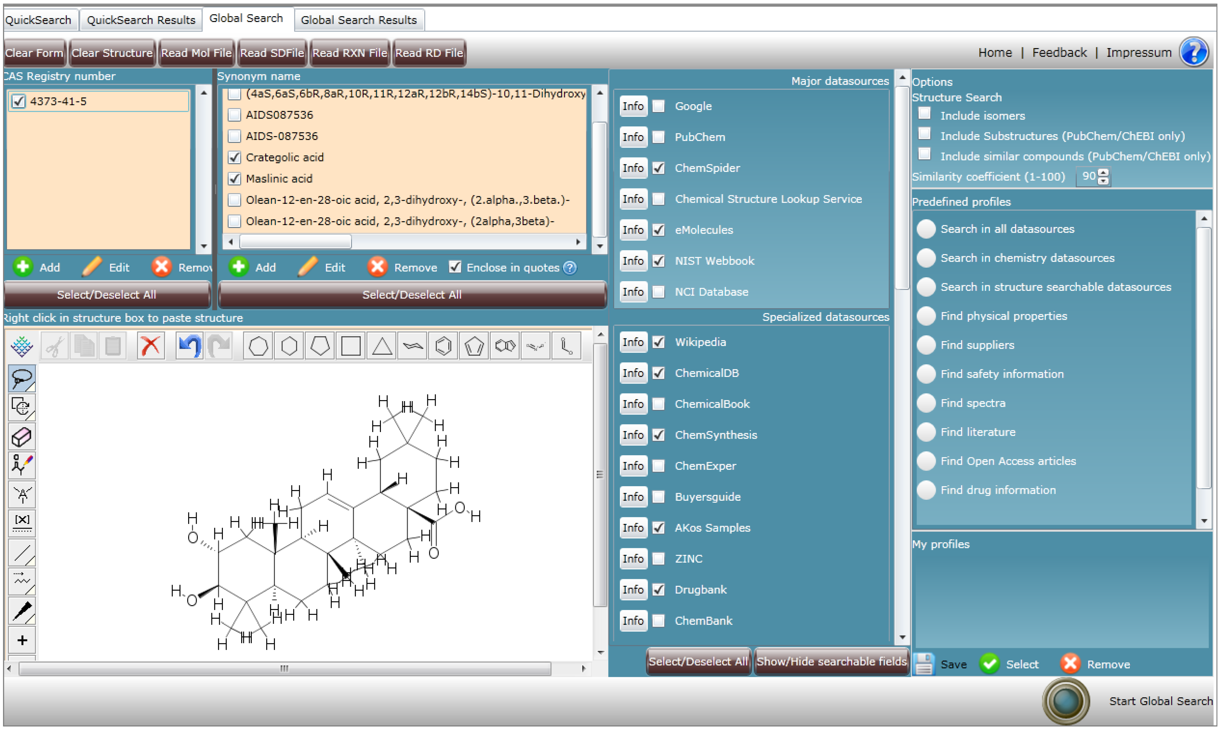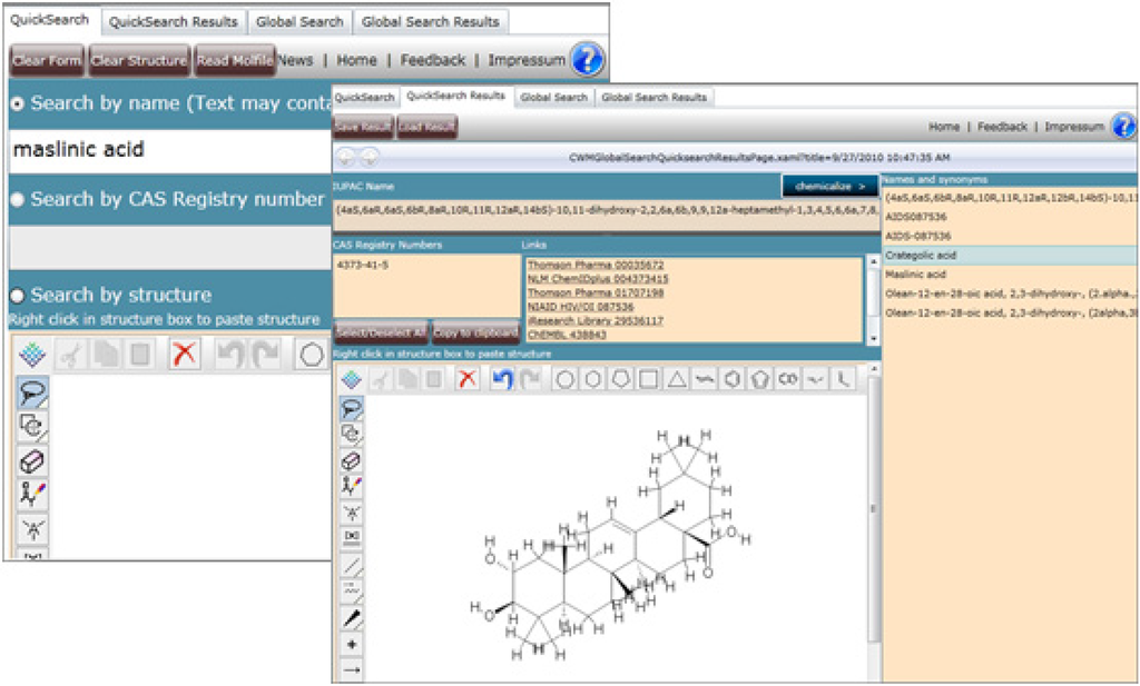 The CWM Global Search user interface Global Search—Combined CAS registry number synonym, and structure search for maslinic acid.
