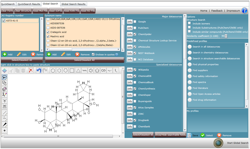 The results of the Quick Search, structure, names and CAS Registry Numbers can be selected for a more comprehensive search using the Global Search. The results allow “cross-linking”, for example: Quick Search can be used to get a list of synonyms for ‘maslinic acid’, and then this list can be used in a Global Search. You will find the natural occurrence of this compound in an article in Wikipedia which only mentions ‘crategolic acid’, (only one of the known synonyms for maslinic acid returned by the QuickSearch), but nowhere does the article in Wikipedia mention ‘maslinic acid’.