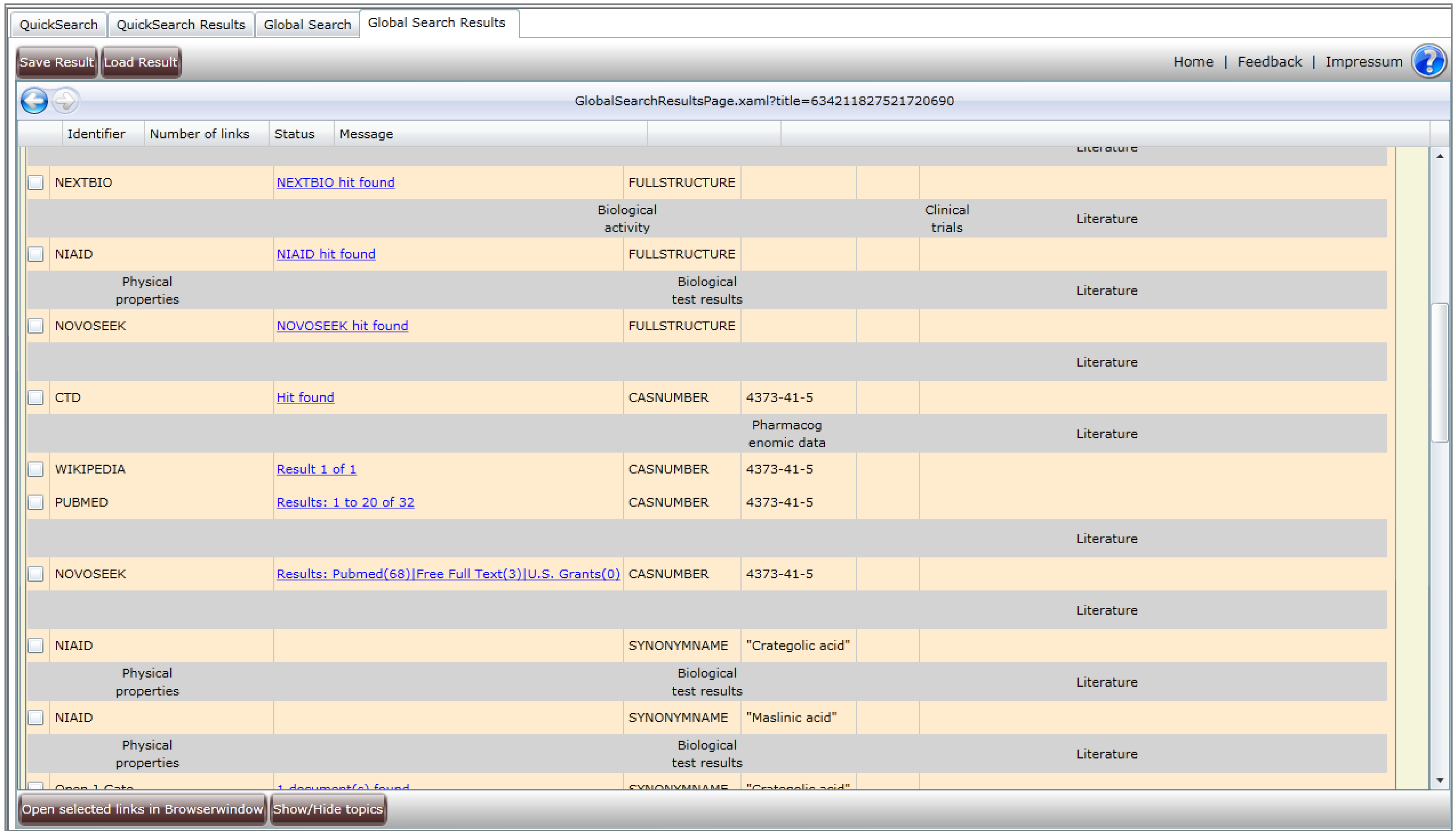 The user interface has a Quick Search and a Global Search. In the Quick Search the user enters structure, name or CAS Registry Number. The program locates the IUPAC name, synonym names, brand names, other known identifiers and CAS Registry Numbers besides the structure using the NCI/CADD Chemical Identifier Resolver [5]. Some hyperlinks are presented that might be already satisfactory for the user. This first search is very fast. An example of the quick search results is shown in Figure 1.
