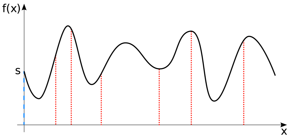 In Figure 1, a polynomial is shown where the y-value is marked blue at x = 0. This is equivalent to the secret s in Shamir's principle. The red marked points are basic values which are distributed to every single party by the dealer. The x-value of the basic values are public, the corresponding f(x)-values are subject to non-disclosure and are known only by the respective party and by the dealer. If there are enough (x, f(x))-pairs available, it is possible to solve the polynomial and calculate the secret s accordingly.