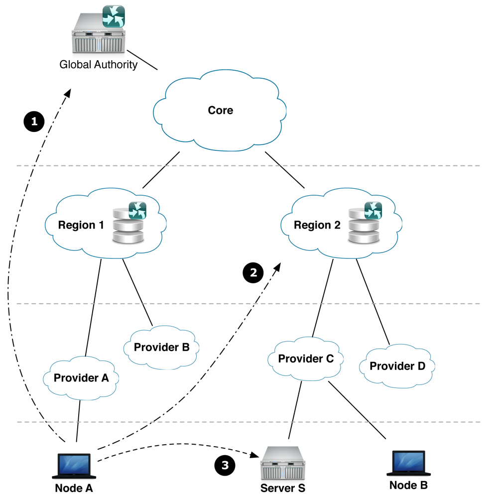 Figure 3 shows the topology of the HiiMap mapping system and an example of the lookup process. In this case, node A wants to establish a connection to a server S. In case node A did not learn the identifier from a domain name system or link—and, therefore, did not learn the regional prefix—it first needs to contact the global authority (1). The global authority returns the regional prefix corresponding to the server's identifier. In a next step—and all succeeding connections—user A directly contacts the region of the server S to resolve the mapping for the locator (2). The mapping system of the region returns the current valid locator and node A is able to send packets addressed to the locator of server S (3). In case node A wants to communicate with another mobile node, the connection setup process remains the same. If the second node, however, roams during the connection, it informs node A directly about its new locator.