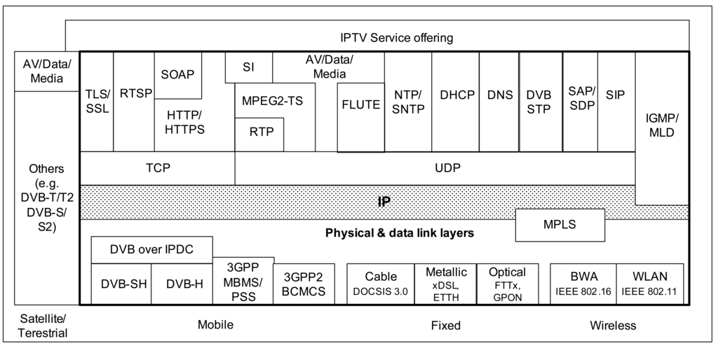 Traditionally, different technologies have been in use in the telco and internet worlds. However, NGN has been built on IETF protocols, like SIP, Diameter and http at the control layer and TCP, UDP, RTP, RTCP and IP at the transport layer. A rich variety of 3GPP and ETSI TISPAN technical specifications describe how these protocols (Figure 5) should be used in an NGN architecture to deliver NGN-based services and features, like voice-over-IP, PSTN emulation, Rich Communication Suite (RCS) [21] and NGN-based IPTV (TISPAN architectures using IMS [23,24] or without IMS [25]).