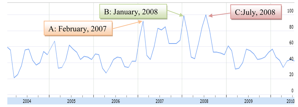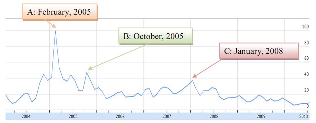 This tool has been used by many researchers. For example, Scharkow and Vogelgesang [20] proposed a new method for measuring aggregate issue salience by analyzing data from search queries typed into Google Insights for Search [21] as compared with aggregate survey data from about 500 telephone interviews. They found a substantial correlation between the two longitudinal measures of issue salience. Hoffman and Novak [22] compared data from Insights for Search with traditional brand tracking metrics (WPP) to monitor brand. They found that search trends data have real-world importance, corresponding well to brand attitudes, awareness, and other metrics provided by the WPP database. Doornik [23] compared flu related searched data from Insights for Search and Google trends with influenza-like illness data provided by the U.S. Centers for Disease Control and Prevention. The correlation of the comparison was 0.92. Askitas and Zimmermann [24] used this tool to find the relationship between search queries and the unemployment rate in Germany, and they found that there was a strong correlation between unemployment related keyword searches and unemployment rates using monthly German data on a simple and parsimonious level. Therefore, we believe that data generated by this online tool are suitable for our study.