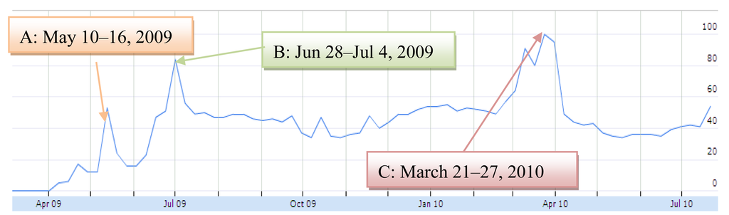 - Insights for Search. Help. Available online: http://www.google.com/support/insights/bin/answer.py?answer=141350&cbid=1nhkwbjlyfq1m&src=cb&lev=answer (accessed on 20 July 2010).