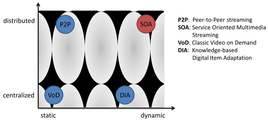Figure 1 shows a classification of the different technologies. The shaded areas visualize the efficiency of the systems. Classic VoD systems show a very high efficiency due to their low protocol overhead. With the increase of the protocol overhead due to distribution and dynamics the efficiency decreases.