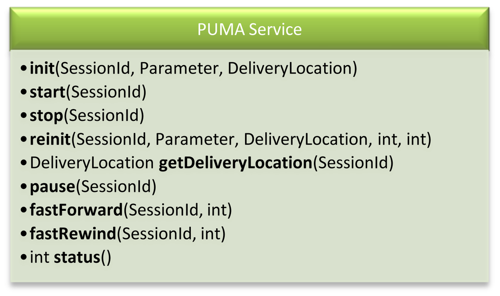 The PUMA service interface (see Figure 11) is meant as a basis for all other PUMA framework Web services. It covers chunk processing and playback operation changes like starting and stopping a stream, redirecting input ports/output locations, status notifications.