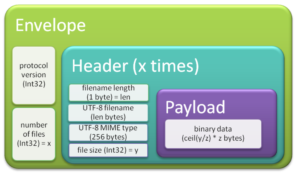 The envelope covers the whole transmission and is only transmitted once. It contains the protocol version, which is an Int32. Int32 must always be 4 bytes big endian (high byte first) encoded. The second part of the envelope is another Int32 value, defining the number of files to be transmitted. This value is intended for a concluding verification if the amount of transmitted files matches the expectation.