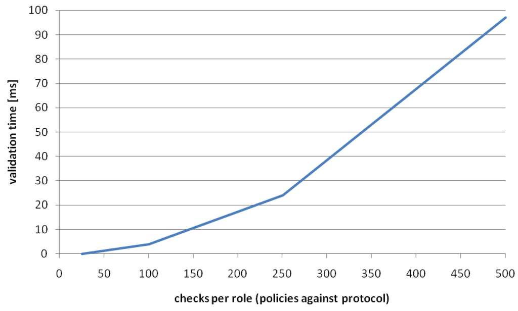 Figure 14 shows the time needed for validating the policies of a service against the protocol specification of a role. As we can see, the validation time stays in the area of hundred milliseconds. However, the policies which are stored as part of the OWL-S service description need to be retrieved from the database and transformed into Java objects, which takes considerably longer then the check itself (around 500–700 ms). Note that this materialization can already be performed for several selected services at an earlier step, e.g., during service selection.