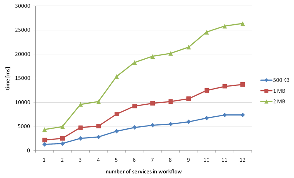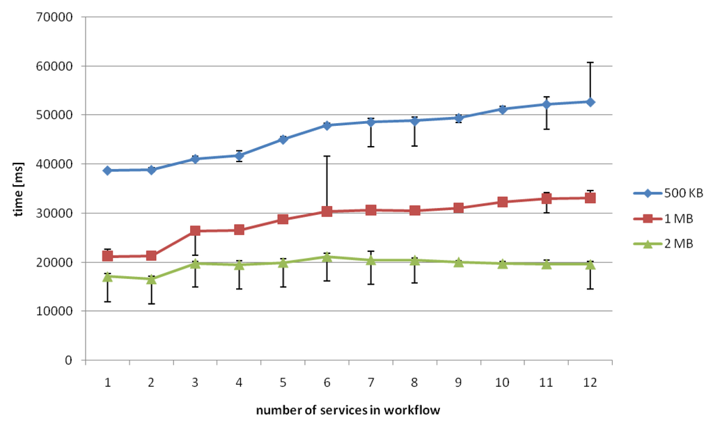 Figure 19 shows that with 500 KB and 1 MB chunks the time increases by small margins until a workflow length of 12 services is reached, whereas the 2 MB chunks need a nearly constant delivery time for each workflow length. The reason for this seems to be a smaller network overhead because of fewer files to transmit.