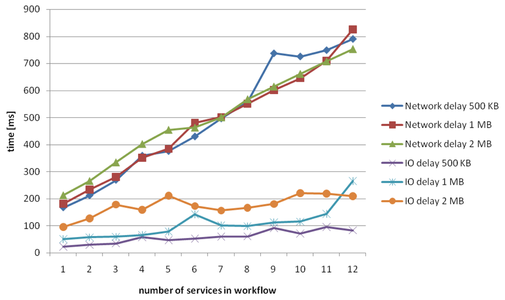 Figure 16 shows the startup time depending on the workflow length. It is notable that each increase in the workflow length adds a constant delay. A further analysis of the composition of the startup time shows, e.g., for a workflow with one service, the startup time of 1995.28 ms with 1 MB chunks is composed of 181.01 ms network delay, 50.66 ms Input/Output (IO) delay and 1763.61 ms for content processing (see Figure 17).