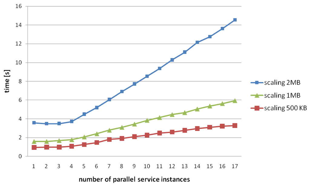 The results indicate that the scaling service is the most processing intensive service type. As server 2 is a four CPU machine up to four services can run in parallel without increasing the processing time. Furthermore, the processing time scales well for more than four concurrent services.