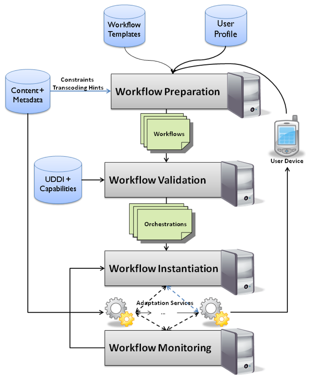 Figure 2 gives an overview of our service-oriented architecture. The central components of the architecture are the workflow preparation, validation, instantiation and monitoring. Each of these parts is responsible for a different step in the adaptation process.