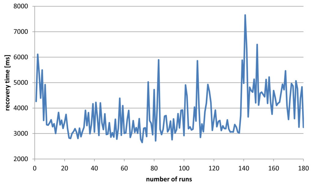 Figure 20 shows the results (in ms) for each recovery from a failure, simulating 180 service failures in total. The average time for recovery is about 3.8 s, including network delays and latency. Considering 1 MB (6 seconds) chunks our PUMA framework still can ensure a smooth playback (for more details see [11]).