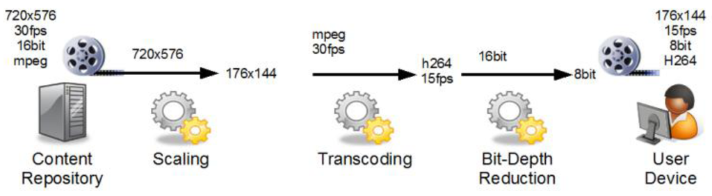 Figure 3 shows an example adaptation workflow with steps for scaling, transcoding and bit-depth reduction to adapt the source content object for the user's display device. Starting on the left with a high resolution source stream, each service processes the data. Our sample workflow starts with a scaling role to reduce the size. The transcoding step decodes the stream and re-encodes it using a different codec, while the last step is a service specialized in adapting the color information for the limited capabilities of the user's display device.