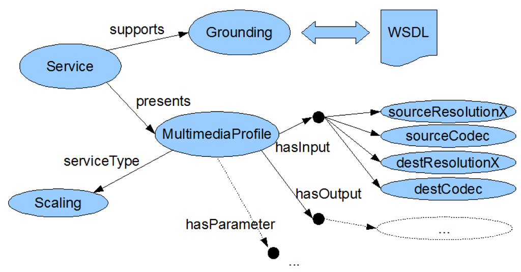 In order to describe the capabilities of our multimedia services, OWL-S [26] was chosen on the premise that it is an established standard for semantic Web services. Furthermore, it allows the selection of Web services not only based on their WSDL description [27]. In contrast, OWL-S service descriptions do not only contain information about the invocation of a service, known as service grounding. They also contain information about “what a service does”, and “how it does it”, known as service profile and service process model, which allows to select services based on capabilities. Such semantic matchmaking techniques have been investigated, e.g., in [28,29].
