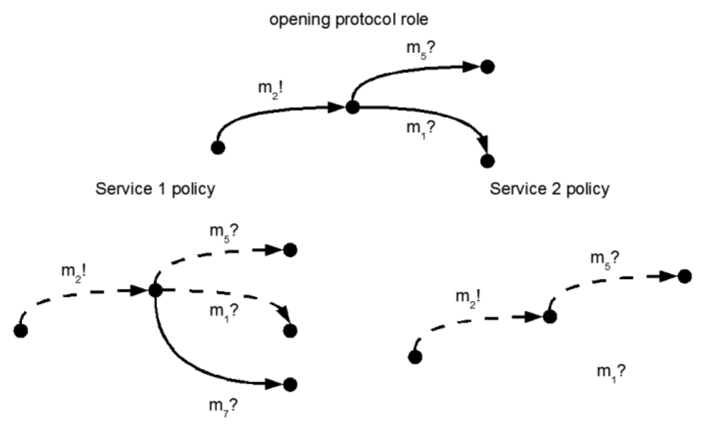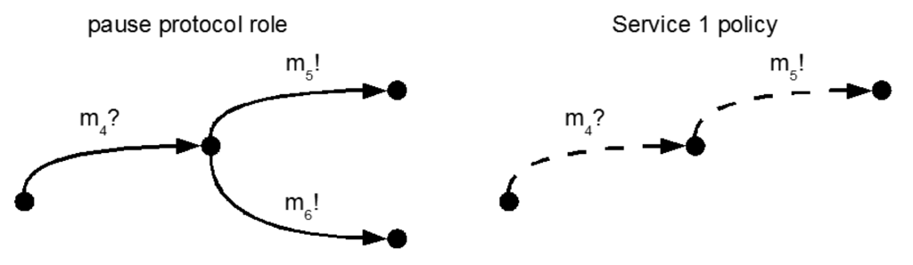 In the first example, the protocol specifies that the receiving of message m1? (recovery after failure) has to be followed by sending m2! (open connection) to another participant. In the example, the policy of service 1 is conformant w.r.t. the requested protocol. This is different for service 2, which additionally can send a message m3! (continue processing) that is not supported by the protocol in this case.