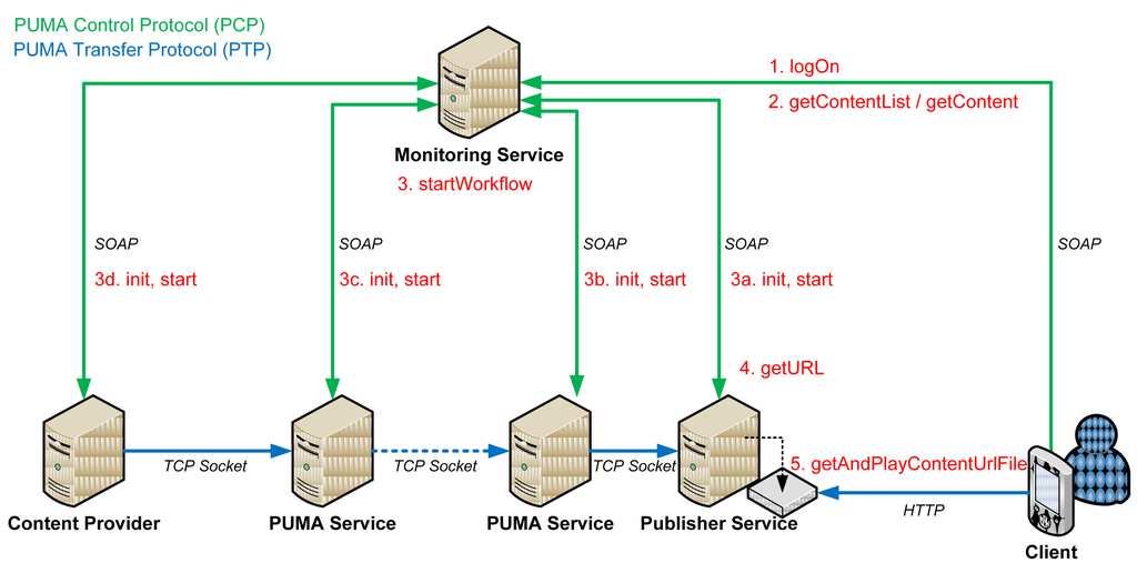 Since every PUMA framework communication can be assigned to one of two categories, our protocol is split into the PUMA Control Protocol (PCP) and the PUMA Transport Protocol (PTP). The former mainly defines high-level message exchange between Web services. For instance, the login procedure, media search and retrieval, event handling and media stream control messages are covered. Furthermore, WSDL interfaces and message sequences are included in the PUMA Control Protocol. Those well-defined interfaces describe exactly how the different Web services can be contacted and controlled, e.g., initialized, started or stopped. PCP relies on SOAP and WSDL. The latter protocol defines low-level data exchange at socket layer and includes specifications of data messages on byte level. Therefore, PTP is based on the well-defined TCP/IP stack and describes how stream socket based connections are established and how data packages have to be formatted.