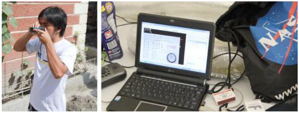 It was them who established the contact, identifying us by our year 2010 OSM uploads of Baseco (Figure 6b). They are volunteer mappers since more than five years, and they joined us during our mapping activities in GK Telus, Quezon City. When they usually do their fieldwork, they celebrate mapping parties. The social part of such parties begins, when all data of a site are collected, processed and uploaded – the same day. They came well equipped – laptop with wireless connection, Garmin GPS tablet devices, laser telemeter and a separate compass (Figure 10). The telemeter was an indoor device and turned out to be not really suitable for outdoor conditions and distances.
