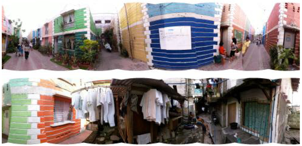 Beside the street name signs, the photo (Figure 6a) shows the successful local implementation of an awarded design intervention: a simple green wall, proposed by one of our MLA students in 2010 [10]. In 2011, a single photo on Flickr [24] mentioning GK village Concepcion helped us to locate the urban quarter but did not come with geo-coordinates. Finally, we were able to find and map the site (Figure 8).