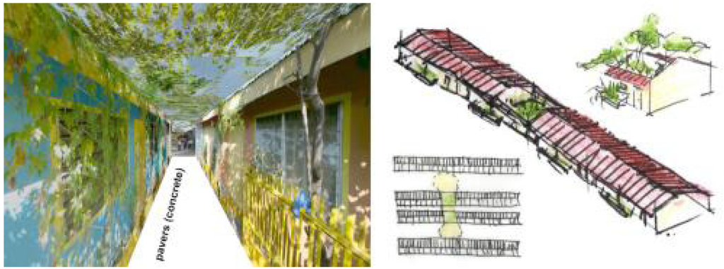 Final step, after map generation, photo documentation and studio design activity, is the 3D visualization of design interventions. Back in the studio the students produce basic Google SketchUp models of the GK villages with building blocks and streetscapes. The SketchUp models are georeferenced using Google Earth and the GPS data. Then we begin to drape photos on these 3D mock-ups. Finally, the 3D models can be interactively visualized on Google Earth and Biosphere3D [21]. Biosphere3D is a free and open source real-time landscape scenery visualization tool. It is laid out for interactive rendering of complex landscape scenarios and landscape elements in geospatial context. The software system enables zooming from various scales up to 1:1 scale, being relevant for the microdesigns of “Needle in a Haystack Gardens” in the informal city context of Manila. In Biosphere3D especially 3D vegetation can be visualized in an interactive and photo-realistic way, an important function for landscape architects [22]. Biosphere3D's interactive photo overlay feature is used to render raw images for accurate photomontages [23].