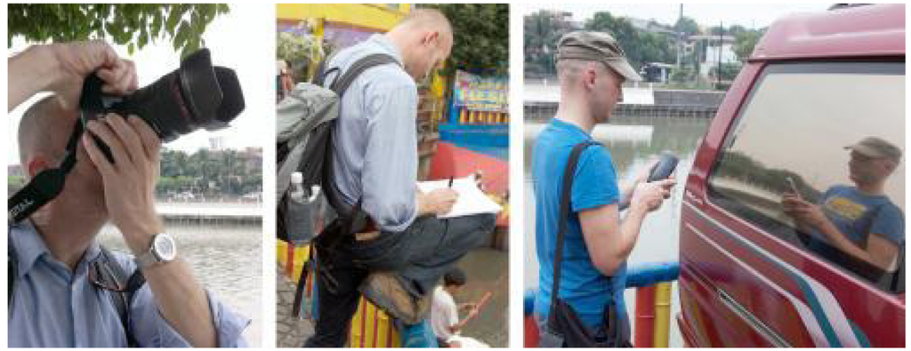 Power-saving tablet computers such as the Apple iPad with its large display would certainly be helpful for on-site mapping, editing, visualization, and presentation. On the other hand, it seems far too large for a discreet capture of photos. Pulling out a camera can already lead to serious trouble in slum areas; in Manila nobody caries a camera, which substantiates that technical equipment can not be minimized enough. Megaurbanity would call for an “Urban Chaos App”, able to record and analyze the overwhelming mixture of multiple noise, stench of excrements and waste, extreme air pollution, numbing exhaust fumes and other “abstract environmental pollution” [31] on-site. Would an App or cloud service that deliver image-based 3D reconstructions in standard formats, generated in real-time during fieldwork walk-throughs also fall under this muser category?