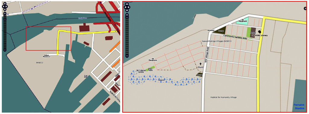 The edited and uploaded geographical data for the selected GK slum-upgrading projects in Manila, published on OSM, lift these previously undocumented and invisible city neighborhoods such as Baseco onto a worldwide accessible and visible public map (Figure 6). We regard this unspectacular action as a first successful step for the slum dwellers respectively ex-slum dwellers away from isolation, addresslessness and “untraceability”, towards a collective urban identity and territorial consciousness [3].