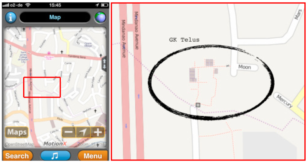 MotionX GPS is a powerful App, but the power consumption of the built-in iPhone GPS receiver is high and sub-street-level accuracy of such standard GPS chips in “urban canyons” is low. The segmentation and narrowness of the informal city does not correspond to such a GPS signal variance and vice versa. To get more than 8–10 m accuracy we would have to move to a differential GPS system. The Filipino OSM volunteers reported that they sometimes use an external antenna in the urban context, mounting it on a bamboo stick to receive better GPS signals. When mapping in areas of high housing density, they recommended setting some reference points in open areas adjacent to these density zones in order to process data with higher accuracy. Elevation measurement from the iPhone 4 was frequently found unreliable and imprecise, i.e., useless.