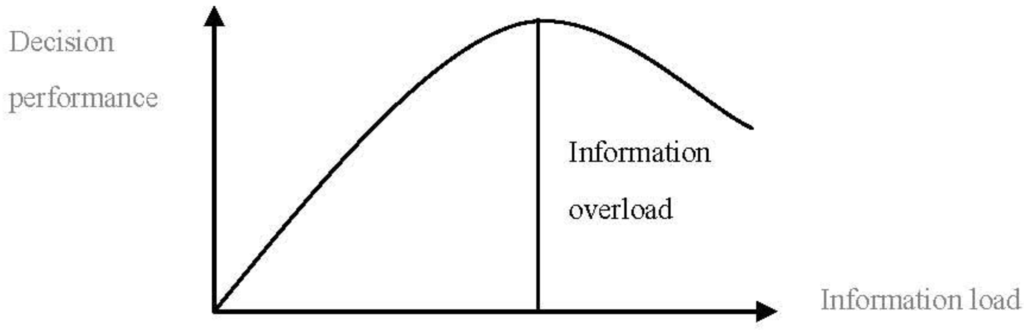 Human attention is a complex mechanism with known (but not too well understood) limitations, and when coupled with memory limitations, we observe a phenomenon called “information overload” in information science. The concept basically refers to the maximum amount of information we can handle, after which, our decision making performance declines (Figure 1) [17,29,30]. Human working memory, for instance, is known to be able to handle maximum seven, in some more conservative measures, only three pieces of information for a very short period of time (i.e., less than 30 s) [31–33].