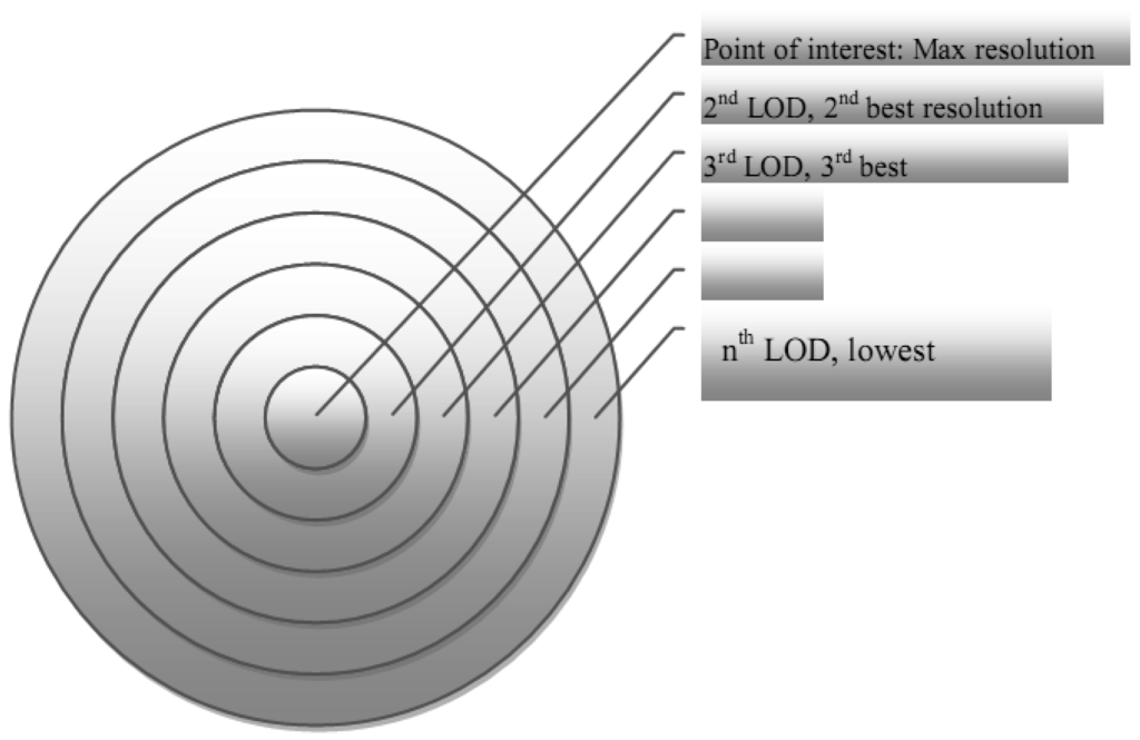 A software approach for creating “lighter” datasets to render or to stream over a network is called level of detail management (often referred to as LOD) in computer graphics literature. First attributed to Clark (1976) [40], LOD is a relatively old concept in computer years and is very commonly employed today. Most LOD approaches are concerned with partially simplifying the geometry of three-dimensional models (e.g., city or terrain models) where appropriate [41–43]. However, conceptually it is possible to draw parallels to other domains dealing with two-dimensional graph simplifications such as progressive loading (transmitting data incrementally) in streaming media, mipmapping in texture management or some of the cartographic generalization processes in map making. Figure 2 (below) shows a simplified model of a two-dimensional space partitioning for managing level of detail using a specific approach called foveation based on perceptual factors [44].