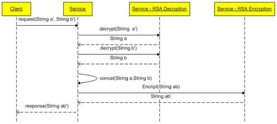 The service first receives as input the two RSA encrypted strings (String a’ and String b’), then decrypts the strings (String a and String b) concatenating them (String ab), and finally encrypts the concatenated response using the RSA algorithm (String ab’). Such encryption is performed by the service itself and not by the container. The example can be easily reformulated in the case where the container performs SOAP encryption according to WS-Security. In this scenario, it is the container that, using an ad-hoc component (e.g., Apache Rampart), is responsible for encrypting and decrypting the input strings and their concatenated version. In the following we consider the first scenario in which encryption and decryption are managed by the service implementation.