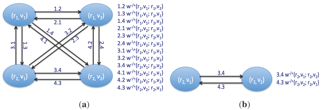 For the sake of simplicity, we are not reinforcing or impairing the other assignments [], so that and for all other r, and v, . Hence, we rewrite Equation (8):