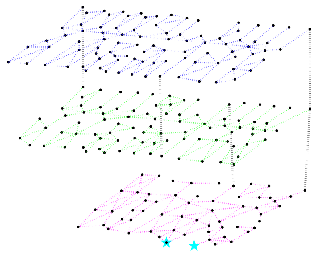Graph representation of the building model []. The two cyan stars on the ground floor mark the position of the building’s exits.