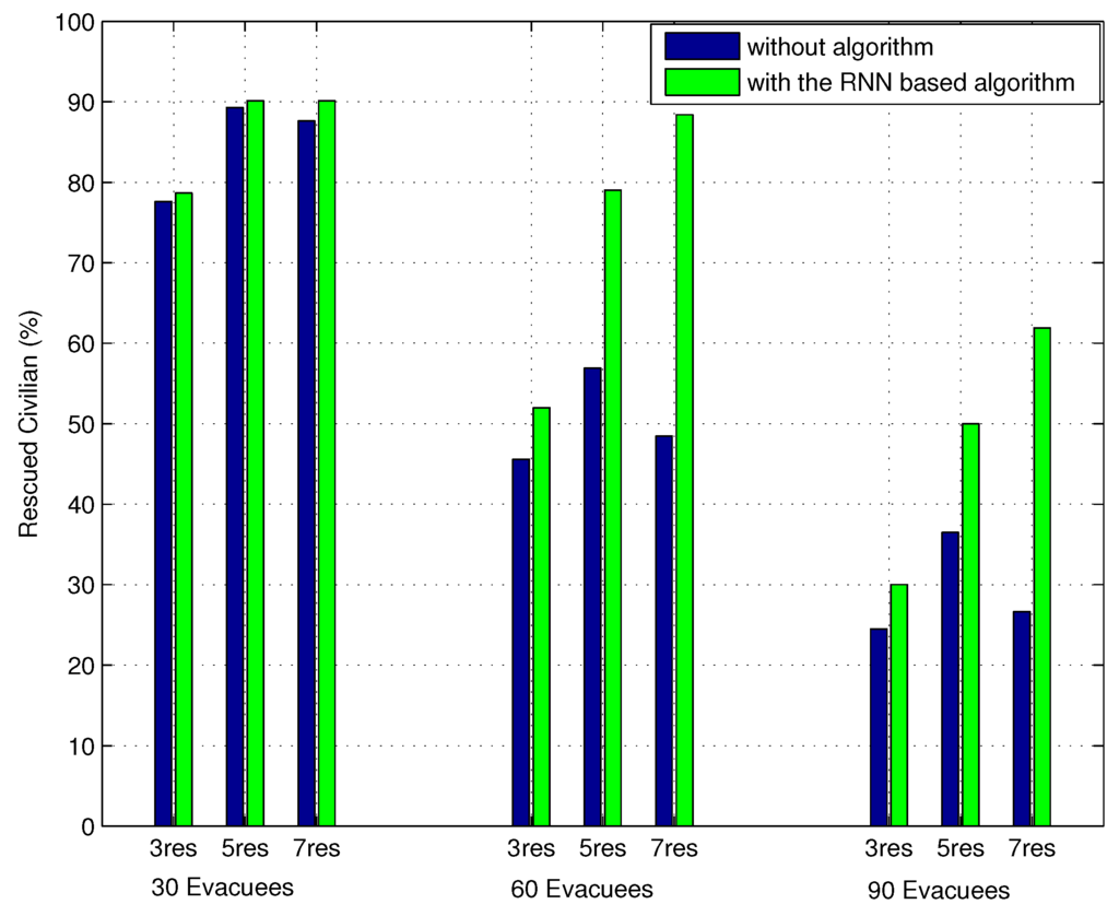 However, with the RNN-based algorithm, the percentage of rescued civilians has a tendency to increase with more rescuers in the system (Figure 3). Although the rescuers still increase the congestion in the building, the RNN-based algorithm makes the rescuers save victims effectively, which dominates the overall performance of the rescue system. This is because the RNN-based algorithm can alleviate the three problems mentioned above by modelling a network of N fully connected neurons with a cost objective function.