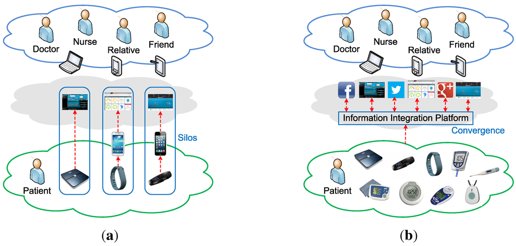 The IIP aims to bridge the communications between everyday objects (i.e., information providers) and Internet-based services (i.e., information consumers), acting as a service broker between the two entities. This broker is expected to break the information reusability issue in a vertical “silo” integration approach that has been chosen by many personal wearable device vendors, including within the healthcare sector; see Figure 1a.