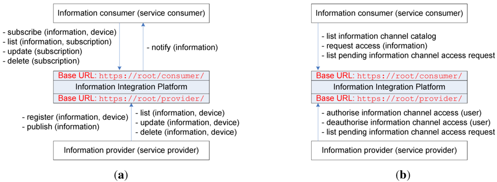 The load balancing layer acts as a proxy service, where both information providers and consumers send requests. The requests are then forwarded to one of the application servers in the service layer that hosts the main logic of the IIP (i.e., the IIP application) based on the load balancing criteria maintained by the load balancer. In the service layer, the IIP’s functionalities, as shown in Figure 2a,b, are realized and exposed through RESTful web service interfaces. All information that needs to be stored, such as information channels, allowed user lists, information channel subscriptions and the actual information of the information channels, are persisted in the data layer. By adopting this three-layer architecture, the IIP’s components can be made redundant and can be scaled up according to deployment needs (e.g., add application nodes when more processing capability is needed, add data nodes when bigger storage capacity is required).