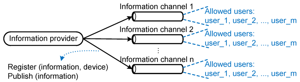 The rows in Table 1 represent the capabilities of users (information consumers) in the IIP, and the columns represent access control lists of information channels. Information consumers can list all information channels (by utilizing a catalog service provided by the IIP), but they can only access/subscribe to information channels listed in their capabilities lists. Since one of the IIP’s main responsibilities is to manage information channels, the access control matrix can be simplified to access control lists only (i.e., the columns in Table 1). Whenever an information provider adds/removes a user (i.e., an information consumer) from/to its allowed user list of a specific information channel it owns, the IIP will update the access control list of the corresponding information channel. Figure 4 shows the relationship between an information provider and its registered information channels with their allowed user lists. The IIP provides additional functionalities, as shown in Figure 2b, for managing access to information channels. Information consumers are provided with resources for listing information channels (information channel catalog service), requesting access to information channels and listing their pending access requests to information channels. Information providers, on the other hand, are provided with resources for authorizing access to information channels that belong to them (adding allowed users to their allowed user lists), deauthorizing access to information channels that belong to them (removing allowed users from their allowed user lists) and listing pending access requests to their information channels.