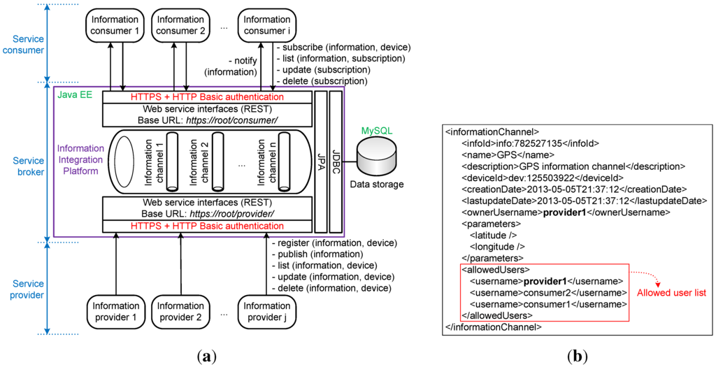 The current prototype of the IIP has been implemented as a Java Enterprise Edition (EE) 6 application in the service layer, following Figure 5, deployed on the Glassfish 3.1.2.2 open source application server. The open source MySQL Cluster 7.3.2 is used for data storage in a clustered environment for high availability and scalability in the data layer, and the Java Persistence API (JPA) is utilized for mapping relational tables in the database to entity objects in the application through Java Database Connectivity (JDBC). EclipseLink 2.3.2 (JPA 2.0) is used as the JPA provider. HTTPS is employed for encrypting all message exchanges between the IIP and both information providers and consumers, and HTTP basic authentication is utilized for simple authentication to access the exposed web resources in the IIP. Figure 6a shows the prototype implementation architecture of the IIP.