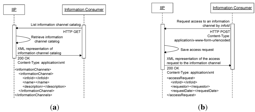 (a) Information channel catalog request sequence diagram; (b) Information channel access request sequence diagram.