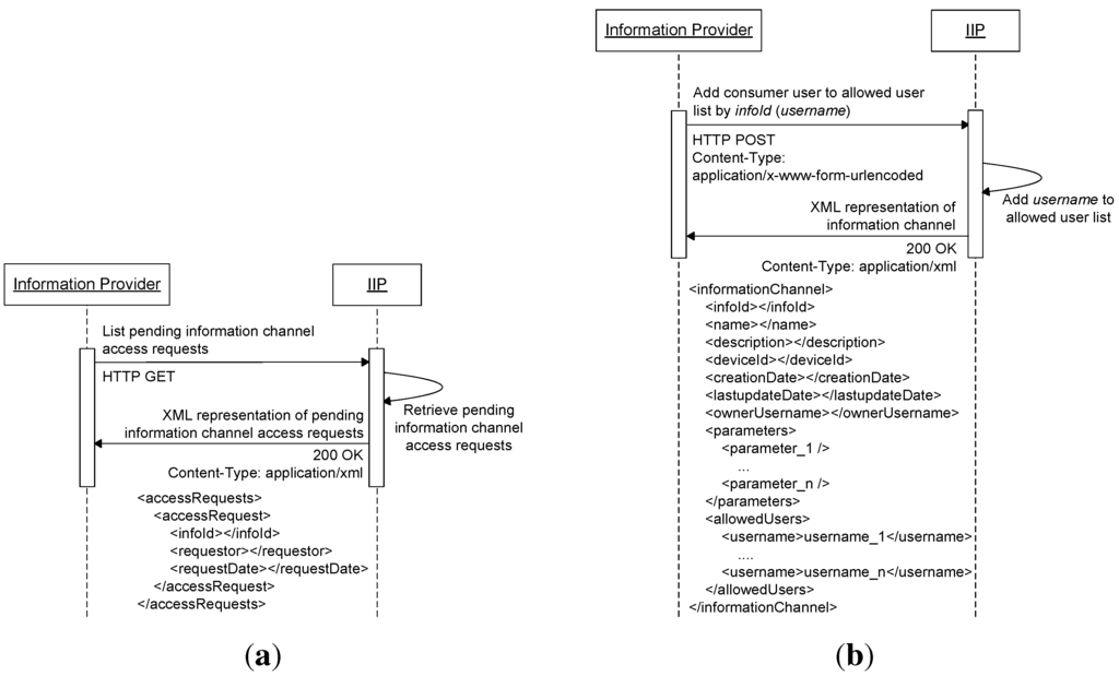Access requests to information channels are stored by the IIP, and a resource for listing pending access requests is made available to information providers through URL https://root/provider/authorization/, which can be accessed via an HTTP GET request. This resource will return all pending access requests to information channels belonging to the caller (i.e., the information provider that accesses this resource) in XML format, as shown in Figure 8a. Information providers can add information consumer users to their information channels’ allowed user lists (for read access) by sending HTTP POST request to a resource provided by the IIP at URL https://root/provider/authorization/{infoId}/. The content of this request should be of type application/x-www-form-urlencoded and contains a parameter called username, which refers to the information consumer user being added to the allowed user list. This resource will return a representation of the affected information channel in XML format, as shown in Figure 8b.
