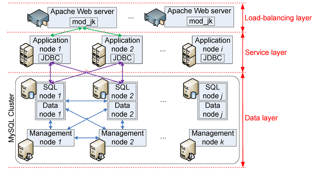 In the data layer (following Figure 5), MySQL Cluster is used for storing all of IIP’s information. The IIP application instance in the service layer is responsible for handling requests from clients, but it does not store any state or information. Instead, it communicates with the back-end database to store information. MySQL Cluster follows a master/master architecture with no single point of failure, providing high availability and scalability of data storage and access. It makes use of a specialized storage engine, called NDBCLUSTER, which is not used in the standard MySQL server, and employs a synchronous replication to guarantee that data is written to multiple nodes upon committing the data. Unlike in the service layer, data replication in the data layer is essential to maintain high availability of data, which, in turn, will make the IIP run properly (i.e., reliable). Three node types of MySQL Cluster are used in the prototype, namely management, data and SQL. Management nodes are utilized for managing the entire cluster. Data nodes are mainly responsible for storing and retrieving data from memory and disk. SQL nodes are used for providing application access to the cluster. Application instances communicate with the MySQL Cluster through the SQL nodes by using JDBC, which is responsible for load balancing queries across the SQL nodes. Figure 9 shows the current prototype’s deployment architecture to accommodate high availability and scalability aspects.
