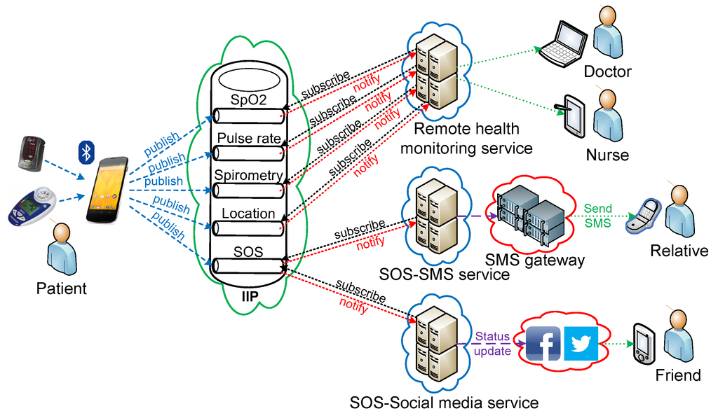 Three prototype services have been implemented within the healthcare domain for patient-centric well-being as proof-of-concept. The services are developed as information consumers that make use of information from the IIP. Figure 10 shows an end-to-end perspective of the developed service prototypes. Information is gathered from several devices relayed through an application gateway running on an Android smartphone and forwarded to the IIP. All implemented services subscribe to information channels of interest and provide services to different healthcare actors.