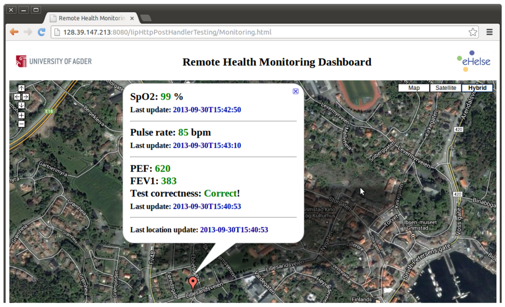 The remote health monitoring service is implemented as a web application that is accessible by the users (e.g., doctors, nurses) via web browsers. It utilizes Java servlet technology for handling incoming HTTP POST notifications from the IIP and simple hypertext markup language (HTML) with asynchronous JavaScript and XML (AJAX) for presenting the output to the users. This service shows the latest measurements information from the remote patient, which currently includes pulse rate, blood oxygen saturation (SpO2), spirometry and location. The service subscribes to these four information channels and receives almost real-time notifications from the IIP. At the patient’s side, an android application has been implemented for gathering measurements from a wireless pulse oximeter and spirometer devices through Bluetooth connections. This application sends all measurements to their corresponding information channels in the IIP. Location information is gathered directly by the Android application from the smartphone’s built-in global positioning system (GPS) sensor. The web application’s user interface is shown in Figure 11. By utilizing this service, healthcare personnel can monitor the patient’s health condition remotely. Since mobile devices are used at the patient’s side, the patient is not restricted to measurements from a specific location.