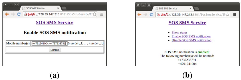 This service provides emergency situation notifications via short message service (SMS) to specific recipients, enabling the patient to inform selected persons (e.g., relatives, friends, nurses) that he/she needs immediate help. The ideal interface to the patient would be a physical alarm button that can be easily pushed in case of emergency. For simplification, an Android application that mimics an alarm button is used in the current prototype. An SOS information channel is registered in the IIP, and a server-side application, based on Java servlet technology, is implemented to subscribe and to handle HTTP POST notifications from the IIP whenever the patient sends SOS messages. A simple web page is provided to the patient to administer which mobile numbers should be notified in case of emergency and also to enable or disable this service. Figure 12a shows a web page for the patient to enable emergency notifications via SMS to a list of mobile numbers, and Figure 12b shows a web page confirming that the service is enabled. When the patient enables this service, the web application subscribes to SOS information channel in the IIP for notifications of emergency events. In reverse, the web application unsubscribes from SOS information channel when this service is disabled by the patient.