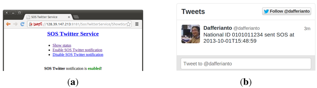 (a) Web interface confirming that SOS-Twitter service is enabled; (b) A tweet of an emergency notification.